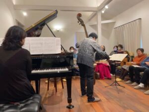 N響首席の皆様は、ピアニストの村沢裕子さんのプロデュースにより、私の地元三郷にある音楽サロンで今まで幾度となくリサイタルを開いておられ、私もその中で朗読をさせて頂く仲。コントラバスの吉田秀さんは今年の2月でした。また、昨夏はなんと宮崎で、こんなにお茶目な姿で街の広場に現れて サプライズ演奏をして下さったんですよ