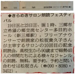 先日の「きらめきサロン朗読フェスティバル」に、「たまたま朝日新聞の小さなお知らせ記事を見たから」とはるばるお越し下さり、そのまま仲間に加わって下さった方です。