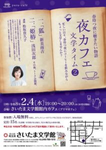 さて、来年2月4日に NPO日本朗読文化協会からの派遣朗読者として さいたま文学館に併設されるカフェで「夜カフェ 文学タイム」」と題した朗読会を開催させて頂くことになりました。名付けて「春待つ夜に聴きたい物語」